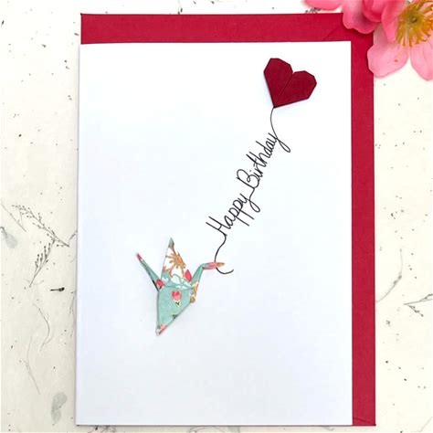 Handmade Birthday Card Origami Crane & Red Mulberry Heart Balloon Japanese Yuzen Paper Customisable